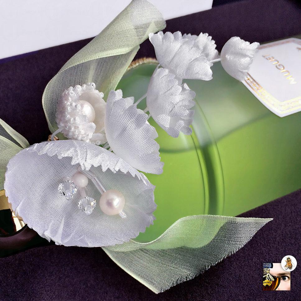 花串由不同大小的鈴蘭組成,繫以綠色大絲帶圈。其中一朵小花,更是以細小的珍珠刺繡而成,別具心思。