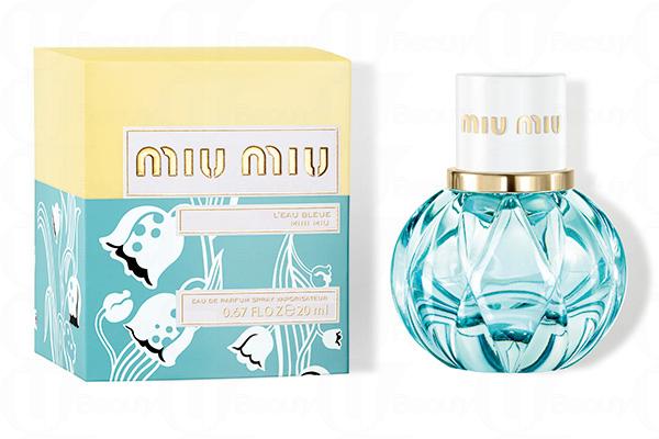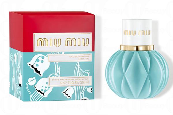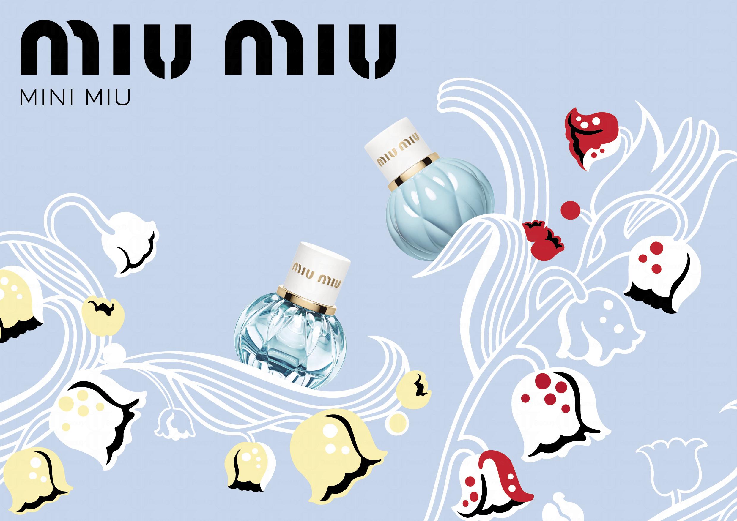 迷你版Miu Miu Eau de Parfum及Miu Miu L'Eau Bleue,保留了原裝版的絎縫皮革紋設計。微型瓶身採用了粉藍色不透明玻璃及藍色透明玻璃瓶設計。外盒分別以復古亮漆紅及淡黃色圓點瓶蓋色調為主色。