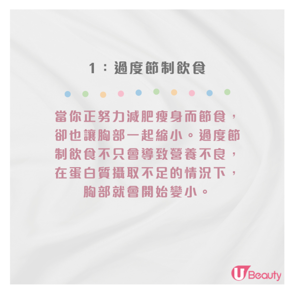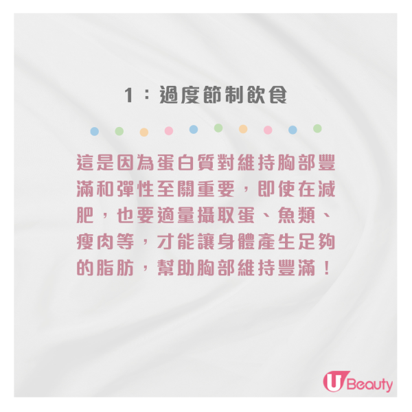 當你正努力減肥瘦身而節食,卻也讓胸部一起縮小。過度節制飲食不只會導致營養不良,在蛋白質攝取不足的情況下,胸部就會開始變小。這是因為蛋白質對維持胸部豐滿和彈性至關重要,即使在減肥,也要適量攝取蛋、魚類、瘦肉等,才能讓身體產生足夠的脂肪,幫助胸部維持豐滿!