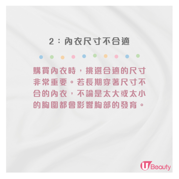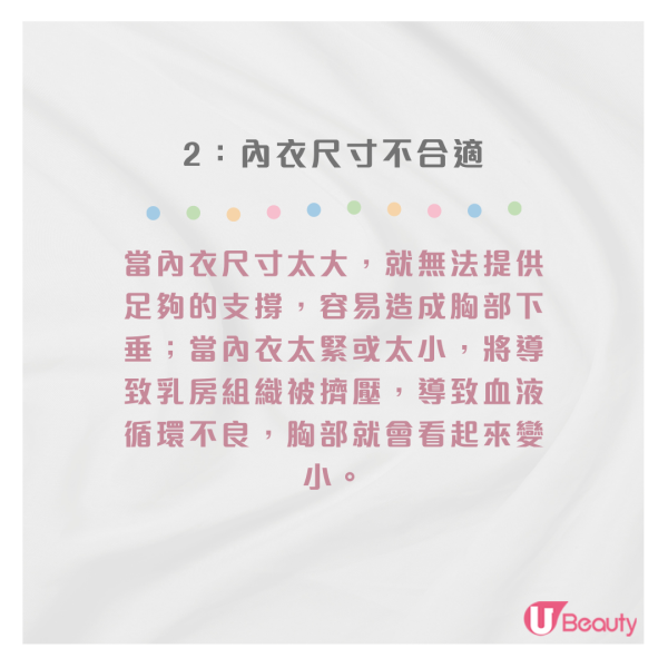 購買內衣時,挑選合適的尺寸非常重要。若長期穿著尺寸不合的內衣,不論是太大或太小的胸圍都會影響胸部的發育。當內衣尺寸太大,就無法提供足夠的支撐,容易造成胸部下垂;當內衣太緊或太小,將導致乳房組織被擠壓,導致血液循環不良,胸部就會看起來變小。