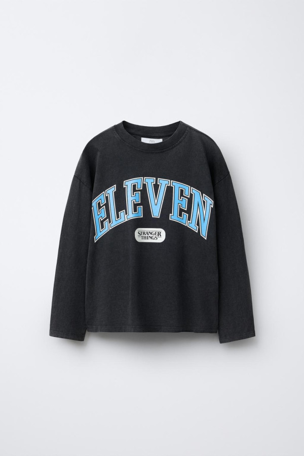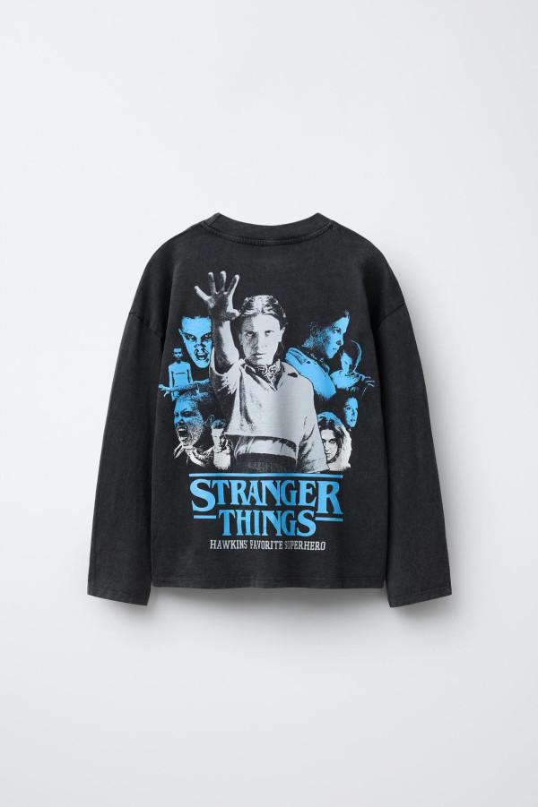 T 恤採用了非常有質感的炭黑水洗工藝,營造出濃濃的 80 年代懷舊感。胸前印有冰藍色的「ELEVEN」字樣,致敬劇中靈魂人物。翻到背面更是驚喜!印有充滿復古漫畫風格的角色拼貼印花,上方寫著「Hawkins Favorite Superhero」,穿上身瞬間自帶主角光環。