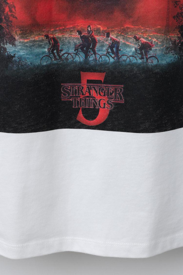 喜歡美式校園風的女生必入這件!白底配上紅色的領口與袖口滾邊,胸前是經典的 STRANGER THINGS 紅色 Logo,簡約又百搭。背面的設計則相當震撼,直接印上了第五季的宣傳視覺圖,紅黑色的色調配上「One Last Adventure」字樣,劇迷看到絕對會尖叫!