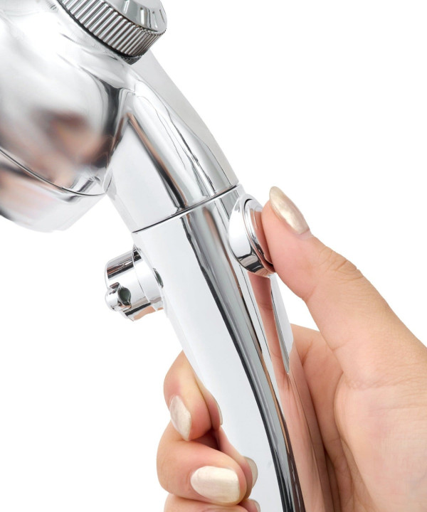 除了美容功效,這款花灑還非常環保。很多女生最擔心「慳水花灑」會導致水壓不足,洗澡不爽快。官方數據顯示這款花灑能節省約 56% 用水量。花灑手柄上設有「手元止水」按鈕和「水量調節」轉盤。洗頭或擦沐浴露時,單手就能立刻暫停出水,不用每次都去扭水龍頭,方便之餘又能進一步節省水費。