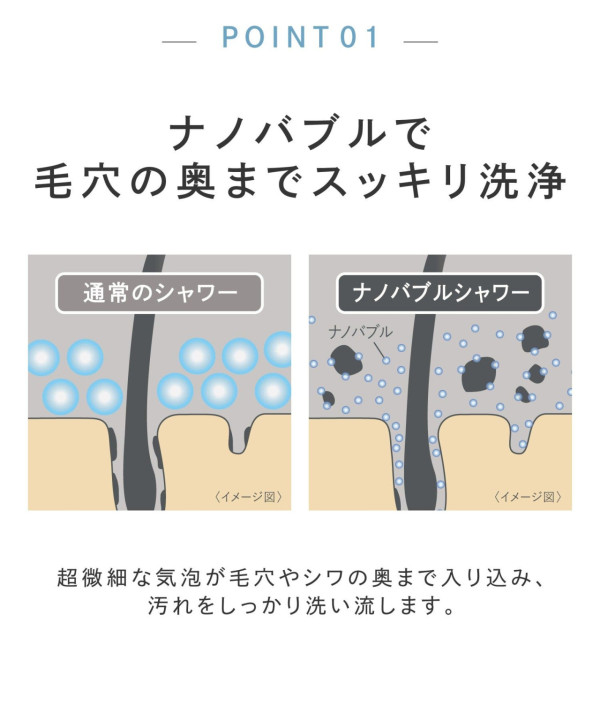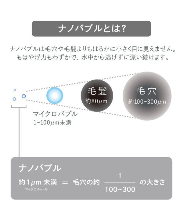這款花灑的核心賣點是「納米氣泡」(Nano Bubble)。 原理是超微細氣泡深入毛孔和皮溝,帶走油脂污垢。氣泡直徑小於 0.001mm,比毛孔(約 0.1-0.3mm)和頭髮還要細小。