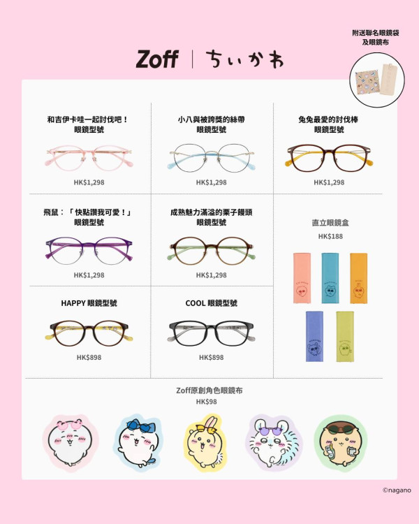 除了 Premium 系列,Zoff 還推出黑色型格的 Cool 型號以及兒童適用的 Happy 型號,眼鏡採用輕盈材質,鏡框內側以戴著眼鏡的 Chiikawa 作點綴,非常可愛。購買以上 2 款系列,即附送原創 COOL&HAPPY 眼鏡袋和眼鏡布。