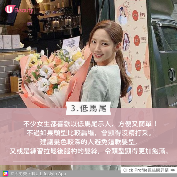 不少女生都喜歡以低馬尾示人,方便又簡單!不過如果頭型比較扁塌,這種髮型會顯得沒精打采。建議髮色較深的人避免這款髮型,又或是練習一下拉鬆後腦杓的髮絲,令頭型顯得更加飽滿。