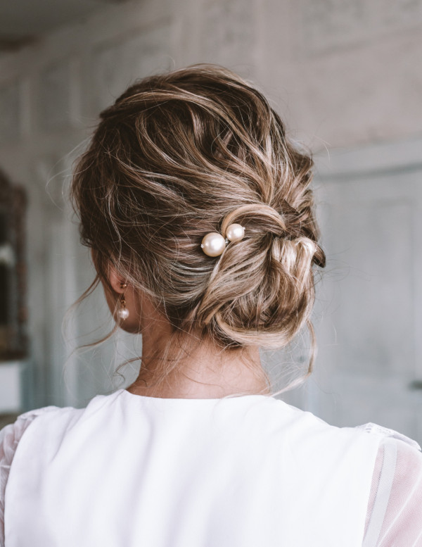 這種新娘髮型以低髮髻為基礎,並添加了珍珠飾品作為點綴,增添了優雅和華麗感。