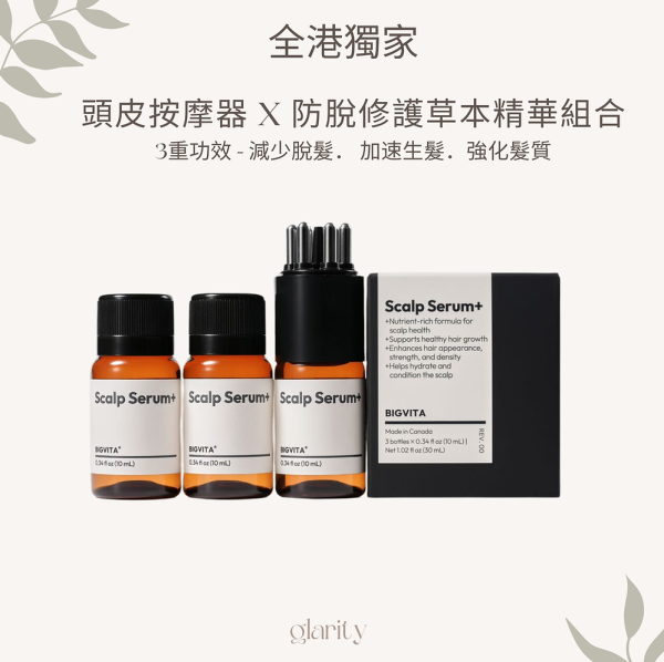 Glarity HK的HAIR+頭皮按摩器 x 防脫修護草本精華組合富含天然植物活髮成分,能深入滋養髮根,改善頭皮頭髮各種問題,包括脫髮、頭髮分岔、頭油過多頭髮塌等等。配合獨特唯一的頭皮按摩設計,可以促進頭部血液循環,幫助加速精華液吸收。