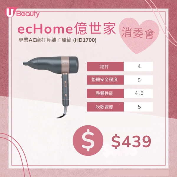 - 消委會高評分風筒推薦 3. ecHome億世家 專業AC摩打負離子風筒 (HD1700) $439