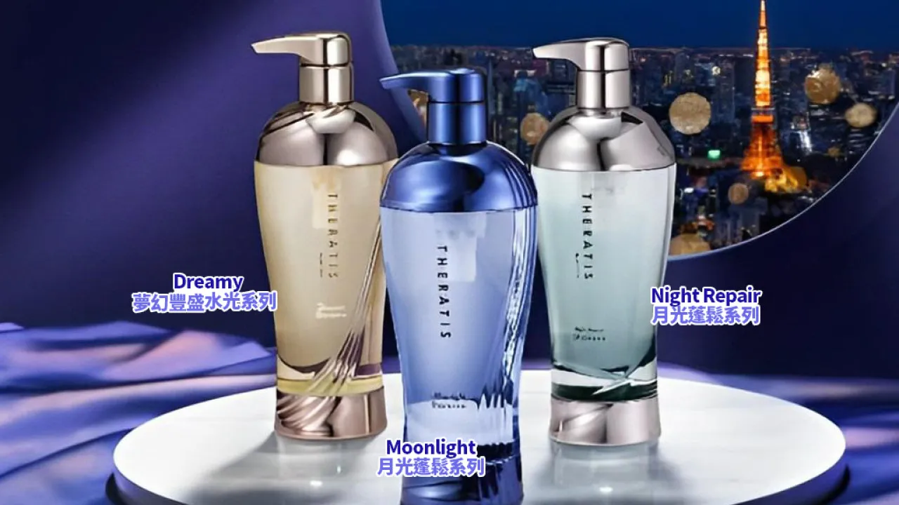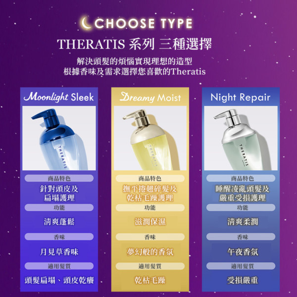 Theratis除引入嶄新的「夜間睡眠護髮」概念外,更於3大系列中注入高達【90%納米護髮美容液】及【夜間柔滑配方】,再根據不同髮質加入針對性的配方,成為備受推崇的Moonlight月光蓬鬆系列(左)、Night Repair夜間修復系列(中)以及Dreamy夢幻豐盛水光系列(右)。