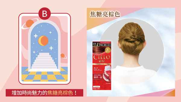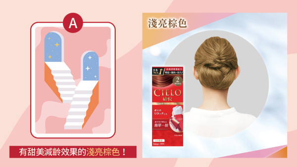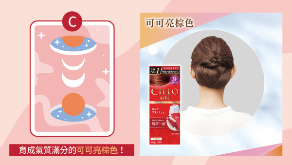 想隨時染出以上3種光感髮色,現在自己也能在家中DIY;連續13年日本 No.1+ 染髮產品製造商CIELO絲悅剛推出了「一按染髮霜」全新最亮3色,分別為2號淺亮棕色、3C號焦糖亮棕色及3P號可可亮棕色,為你按心情轉換造型增添更多選擇!