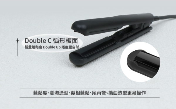 這款造型夾最引人注目的設計,就是採用了獨特的弧形板面,以一凹一凸的設計,易於控制弧度,令造型時更得心應手,特別是在蓬鬆度和捲度的打造上,無論是瀏海造型、髮根蓬鬆、尾內彎,或是捲曲造型,都能輕鬆應對。此外,這款迷你造型夾輕巧便攜,僅重86克,方便隨身攜帶,特別適合旅行使用,無重量負擔。