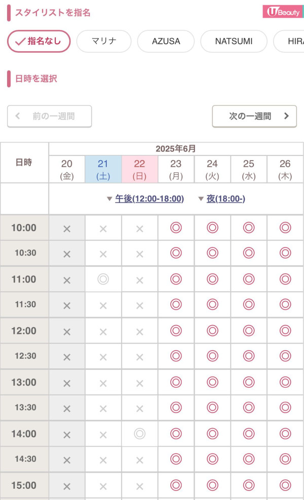 在選定服務項目後,務必仔細查看沙龍提供的折扣券。標示「新規」(shinki)的優惠券通常是為首次到店的顧客準備的。在選擇服務套餐時,請務必確認該服務是否包含洗髮與吹髮,以及價格是針對補染還是全染。接著,系統會顯示可預約的時間表,您可以選擇最理想的時段。一般而言,平日白天(例如週二至週四的上午時段)通常會有較多的空位,店內也相對較少人,能確保更舒適的社交距離。如果您沒有特別指定的設計師,可以選擇「指名なし」(shimei nashi),即不指定設計師。