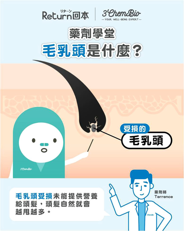 健康的頭髮生長週期為2至6年,它們會經歷成長期、衰退期及休止期,當頭髮進入休止期時,便是準備脫落的開始!而毛乳頭則是主宰頭髮生命的大腦;當毛乳頭受損時,導致未能提供營養給頭髮,因此失去「生長、脫落、再生」能力,因此要阻截頭髮脫落,就要從毛乳頭去解決問題。