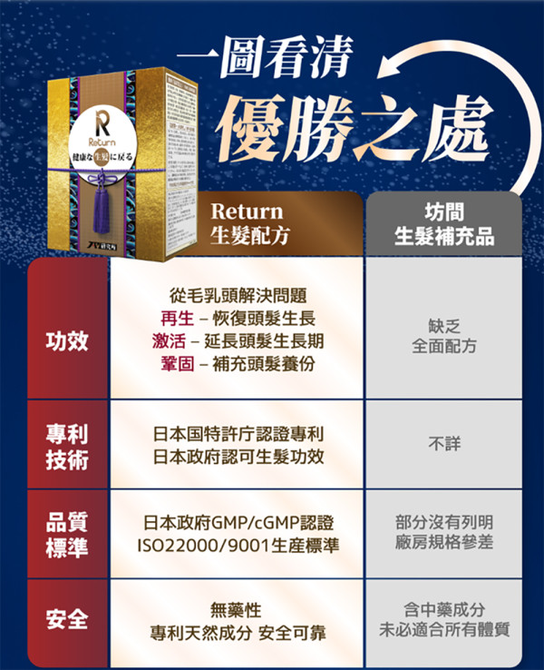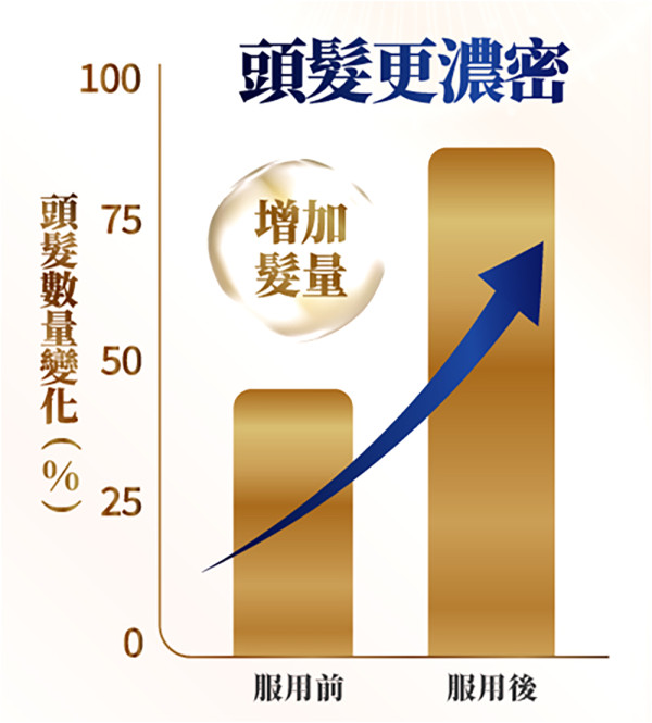 據調查顯示,服用Return生髮配方後,用家髮量大增至近30%,效果令人滿意!