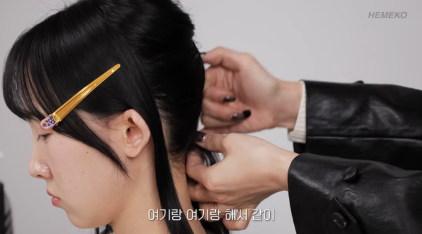 先將耳朵上方的頭髮夾起,在臉頰旁保留少許自然的碎髮,能有效修飾臉型,達至小臉效果!