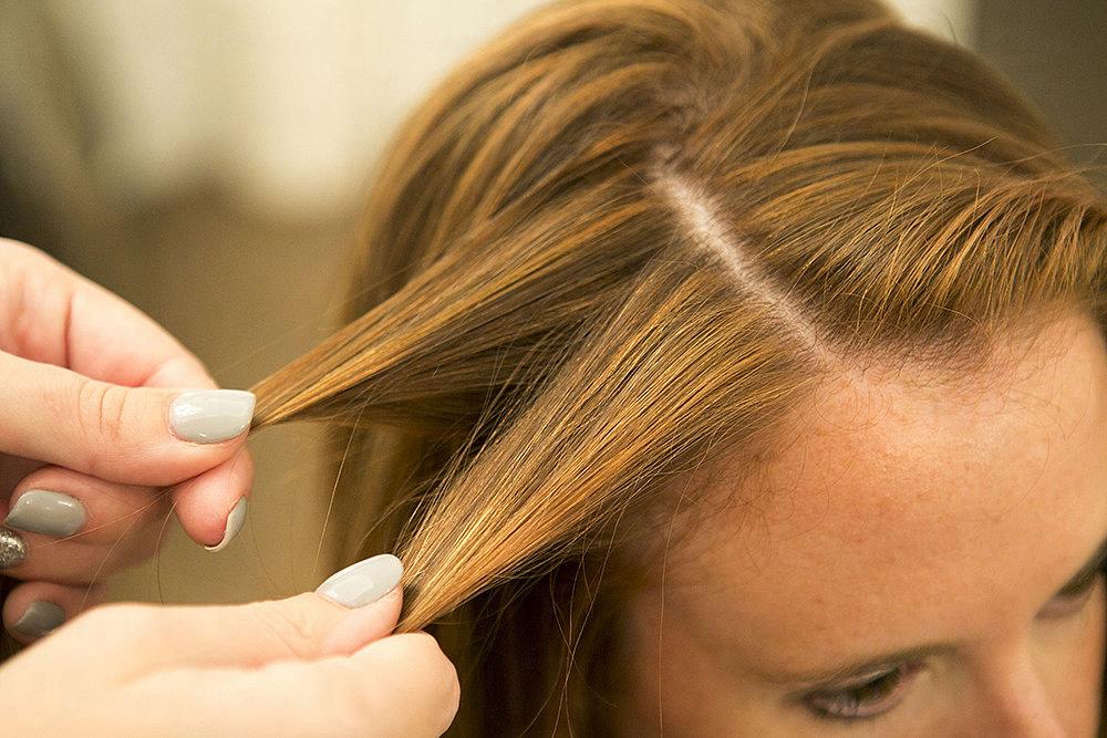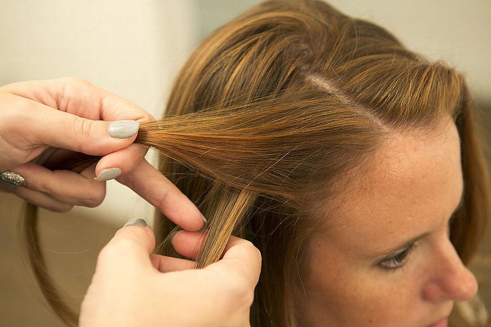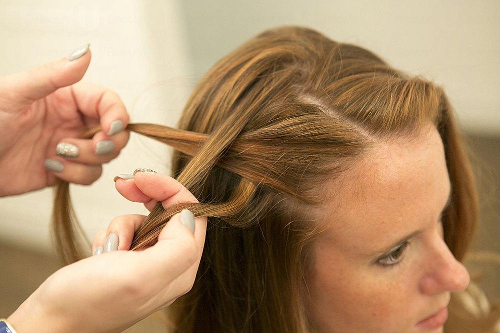 9. 為了隱藏髮尾使髮型看起來更美觀,把髮尾隱藏在頭髮中並用髮夾以「X」字型的方式夾好。