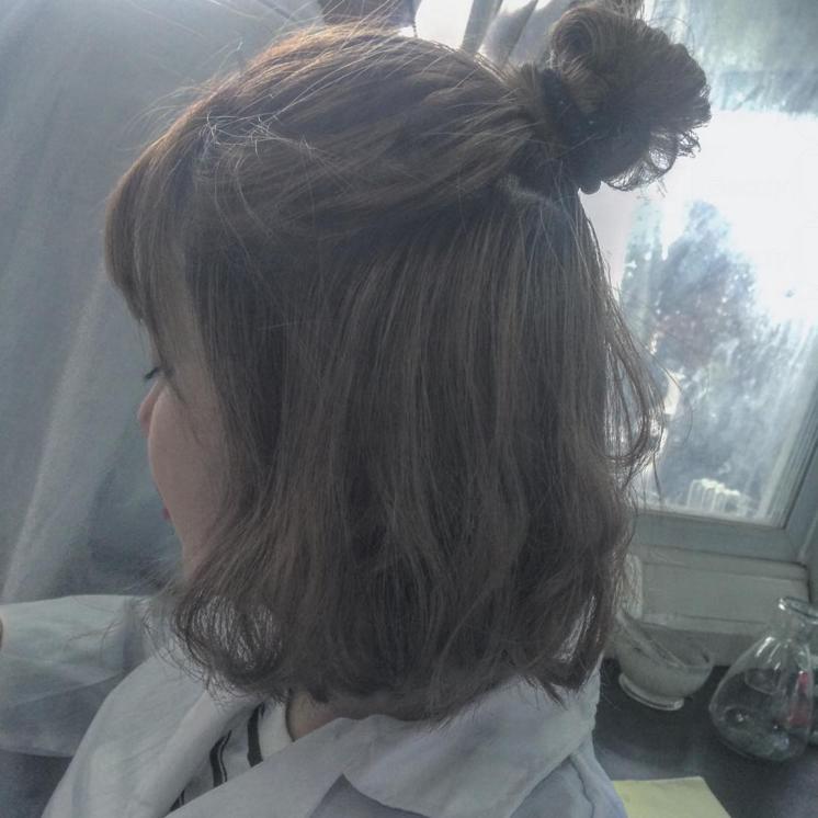 第一個,亦是最簡單的方法,就是先把頭頂的頭髮分出來,利用髮圈好像綁馬尾般綁著,最後一圈不要把辮子完全的拉出來,只留下髮尾的一半便可,這樣就完成半丸子頭!這個綁法比較快捷,效果亦較隨意。