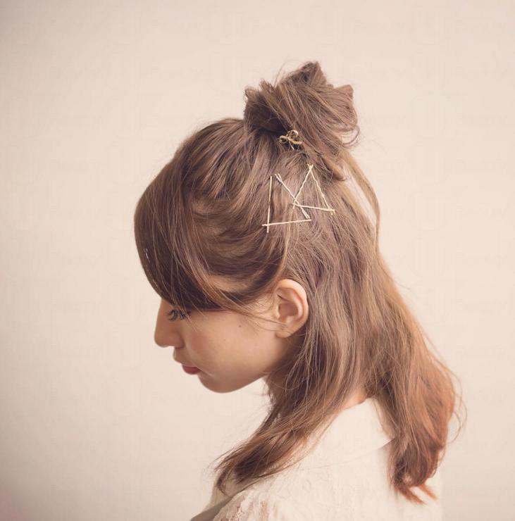 另外,喜歡日系感覺的女生亦可試試綁完丸子頭後,在旁邊以不規則的方式夾上金屬系髮夾,形象會更突出又時尚。