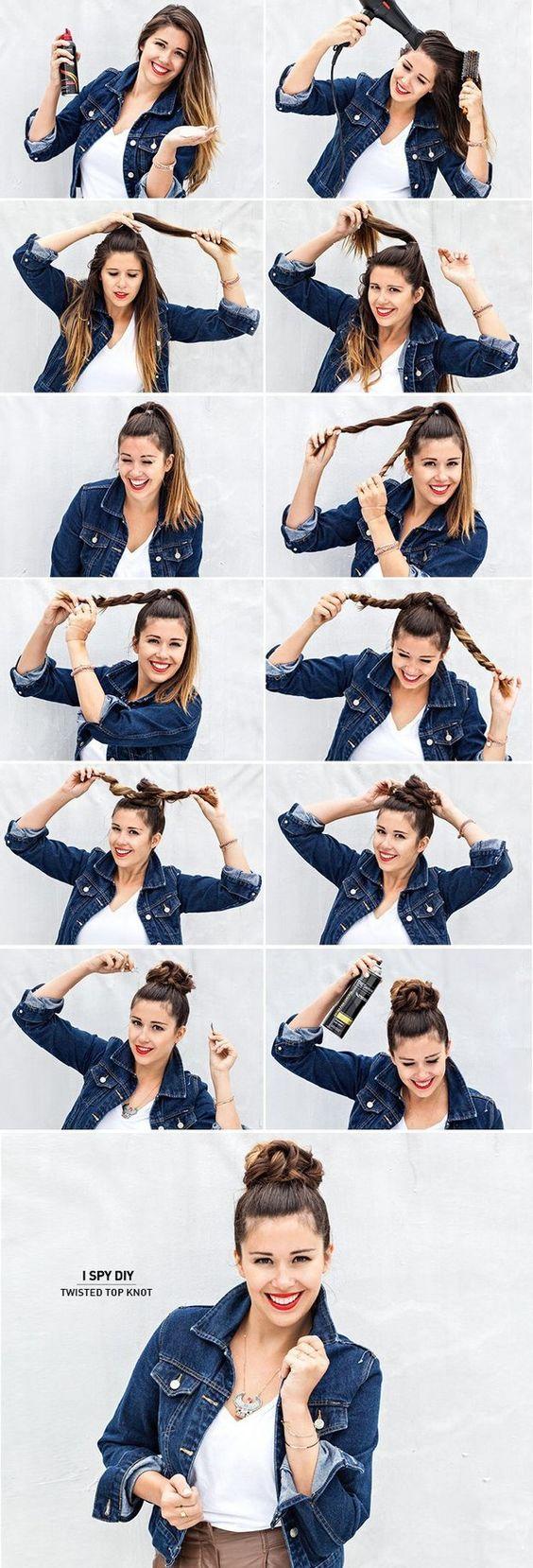 這款髮型做法與第3款做法類似,分別在這種做法是先用橡筋固定每邊髮尾,然後將兩條髮束在頭頂上交叉扭轉成髮髻般,再以髮夾固定。