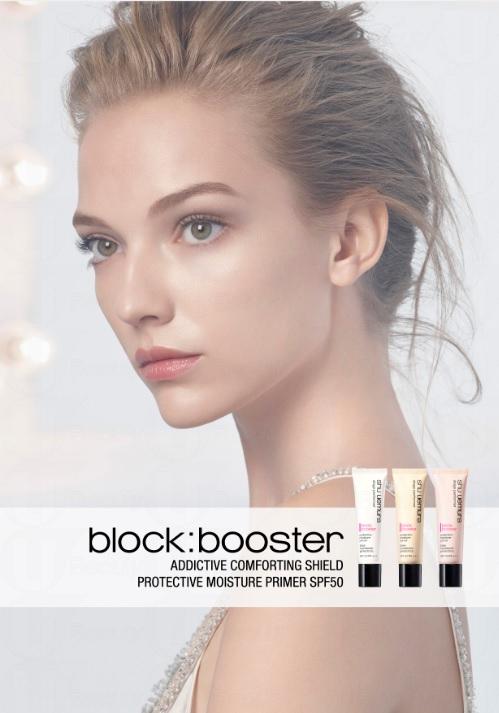 這個秋季,shu uemura隆重推出全新星級妝前底霜瞬間亮膚保濕底霜stage performer block:booster SPF50 PA+++,滿足都會女性對底霜的全面要求。block:booster能抵禦紫外線侵襲,阻止污染物黏附在肌膚上形成侵害,並於塗抹一瞬間為肌膚注入水分。配合植村秀的最新光線反射技術,能瞬間均勻膚色,擊退暗啞面容。
