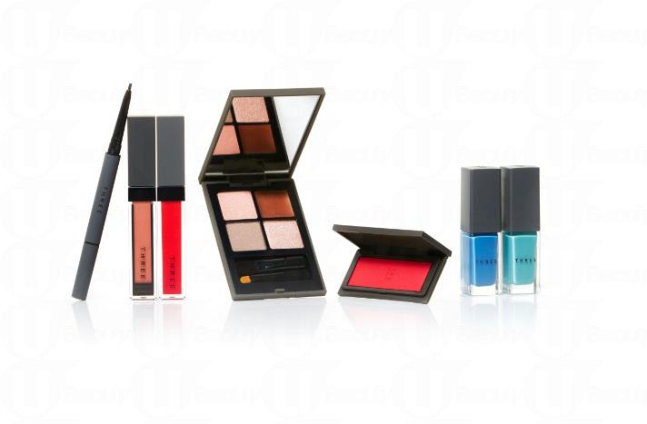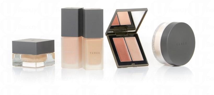 「THREE」彩妝系列分為兩項底妝及重點彩妝,每件產品皆特別重著質感。底妝產品中蘊含有機植物油,修護素肌的同時,亦可創造出充滿活力的妝效。而重點彩妝中的色調具透明感,容易與肌膚自然融和,層次暈疊更增添立體感。形象方面,則鼓勵女性大膽展現自我及創新,打造屬於自己的時尚前衛感。