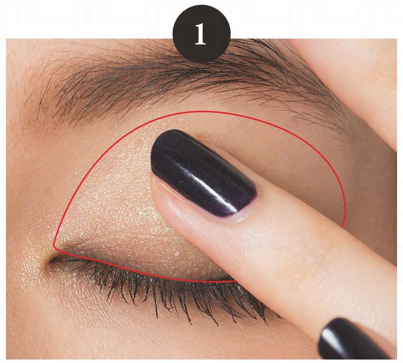 然後將墨綠色調的眼影從眼尾位置開始,沿著眼簾摺痕位置搽到眼睛中間,只要輕掃一層薄薄的墨綠色眼影就足夠了。