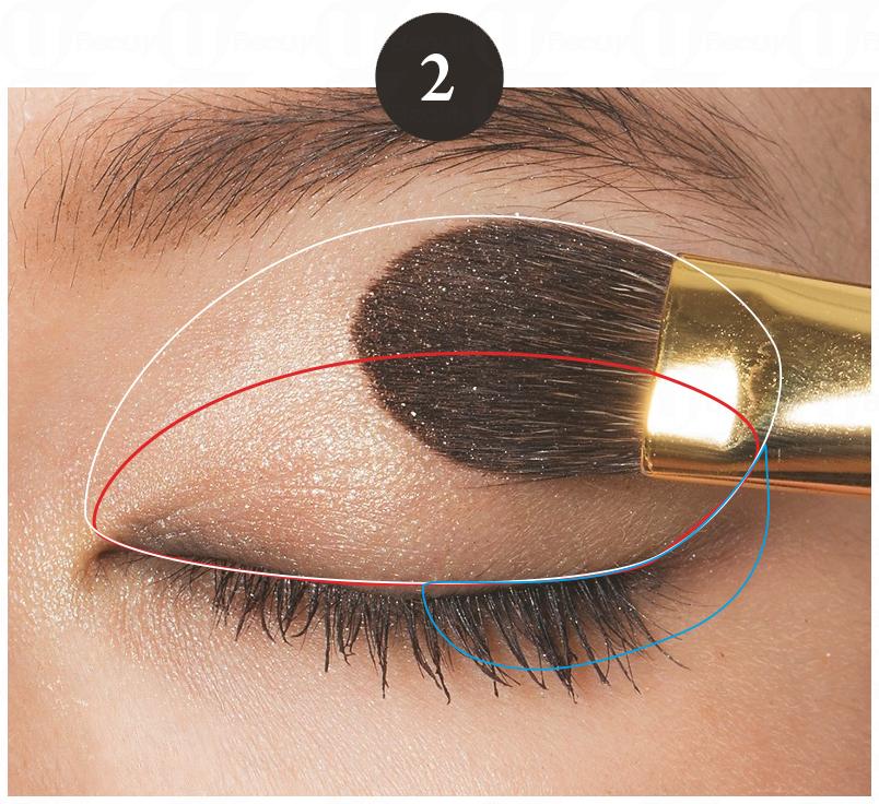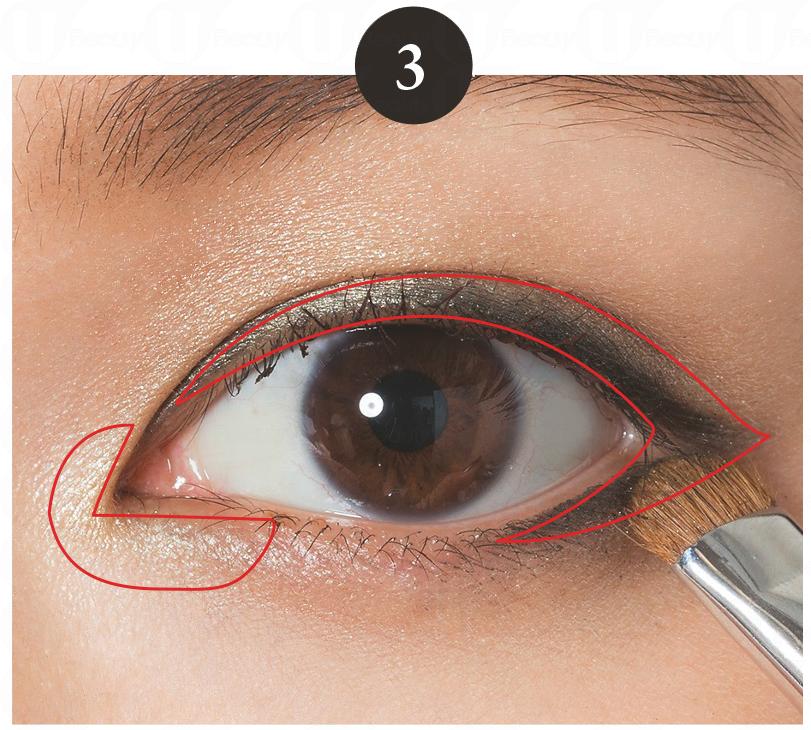 使用深灰色眼影在上眼瞼位置及下眼瞼的眼尾位置,輕輕畫出一條眼線,緊記要把眼影輕輕掃開以打造自然的感覺。最後,以淺灰色眼影打亮眼頭位置便可。