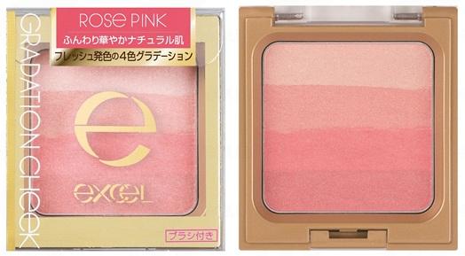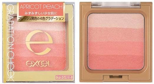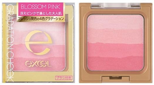 excel 漸層塑型胭脂每盒俱備四色層次,五款組合,可配合不同服飾,打造柔和、清新、成熟、活潑、或時尚等不同造型。配方為亞洲女性肌膚而設,加入了白金亮光粒子,能加強折射效果,雙頰宛若自然泛紅、晶瑩剔透。胭脂上段2個淺色部份更可作光影粉使用,締造立體輪廓。