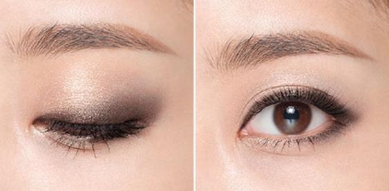 先畫上眼臉,較深的主色向下,沿上眼線由眼尾畫向眼頭造出漸層眼影。然後於下眼線前2/3位置畫上較淺的閃爍色調。再於後1/3至眼尾位置畫上深主色調,突顯深邃立體效果。