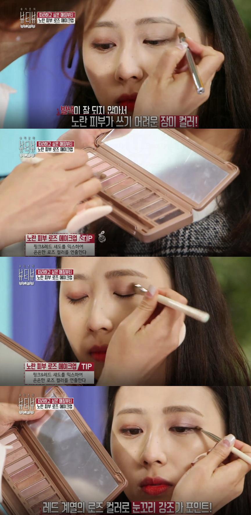 底妝:申愛化妝師指,偏黃皮膚的人不宜使用黃色底霜,應該將粉紅混合紫色底霜,一樣用化妝掃推開,再用海棉輕輕按壓,讓皮膚看起來有生氣卻不顯黃。