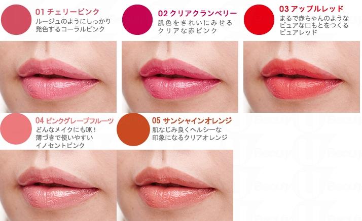 彩色潤唇膏共有5色,包括#01 櫻桃粉、#02 小紅莓、#03 蘋果紅、#04 西柚粉及#05 陽光橙。