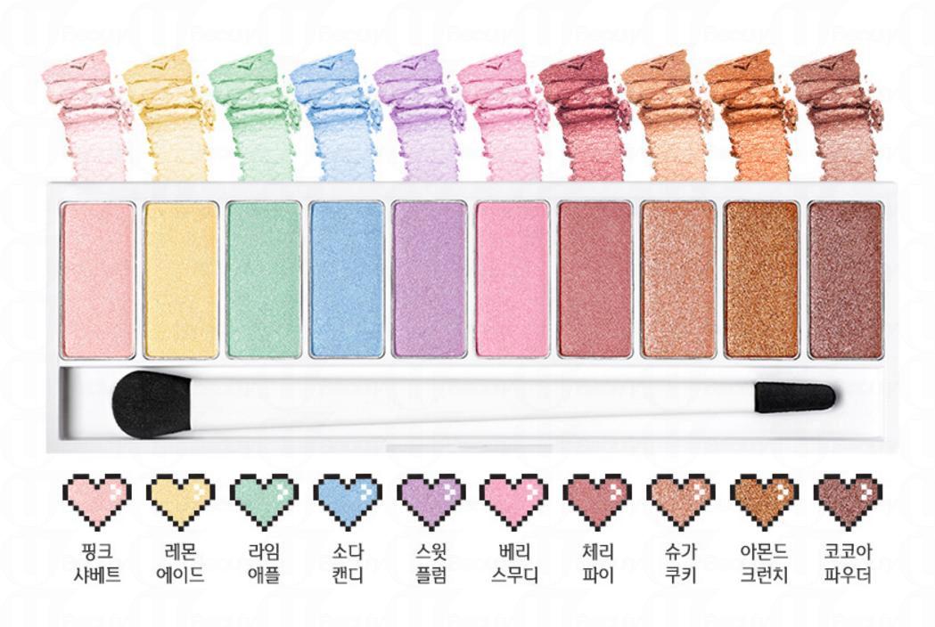 一盒10色的眼影盤,包括明亮的糖果色及基本的大地色系,全是柔和的閃爍質感,色澤飽和,而且感覺非常細密,不會有「飛粉」的情況出現。