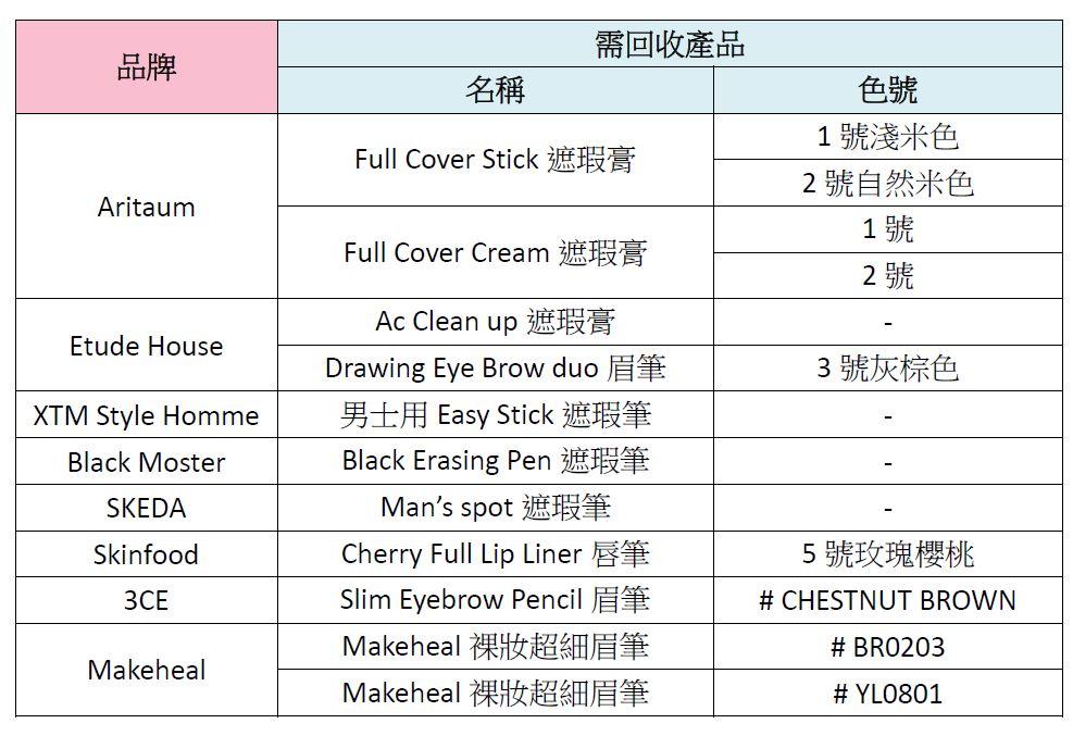 韓國食物及藥品安全處(KFDA)於周一(3月19日),發佈一則回收重金屬含量超標化妝品的新聞稿。一共13款韓國化妝品,其中包括遮瑕及眉筆產品等,被驗出重金屬「銻(Antimon)」含量超標。