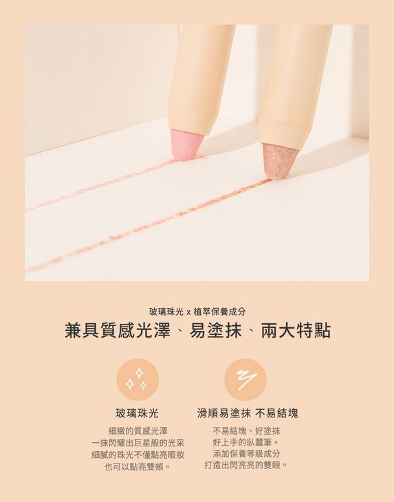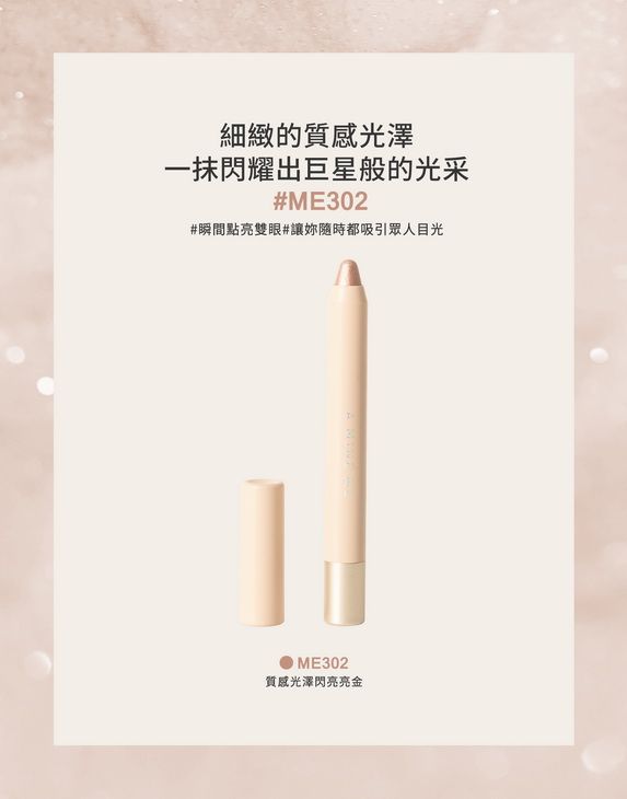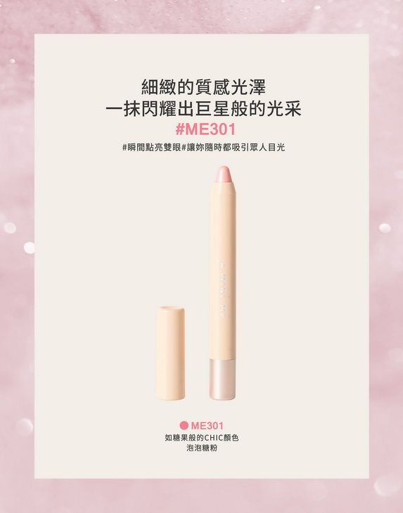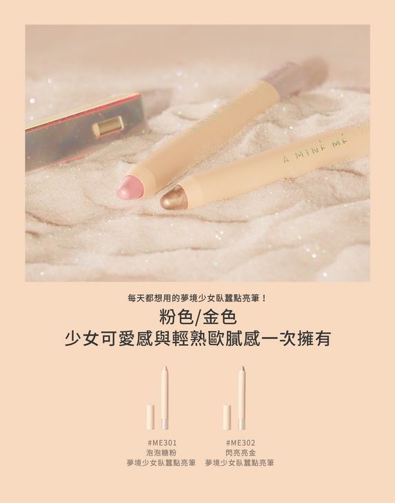 臥蠶點亮筆是不少女生的最愛,除了可以讓眼睛更有神之外,還可以有bling bling功效,這次A MINÉ MÉ推出了一共兩個不同色系,分別是#ME301 泡泡糖粉和#ME302 閃亮亮金,色號的命名呼應了白日夢企劃的少女夢境,真的超燒!