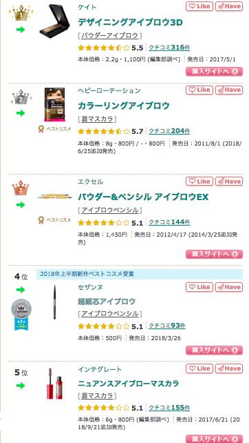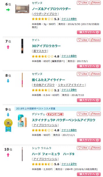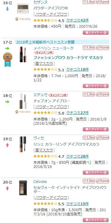 商品價格以官方商店為準,大家可以到品牌官網瀏覽更多銷售詳情,以下為截至2018年11月23日於Cosme的眉部產品排行榜結果。