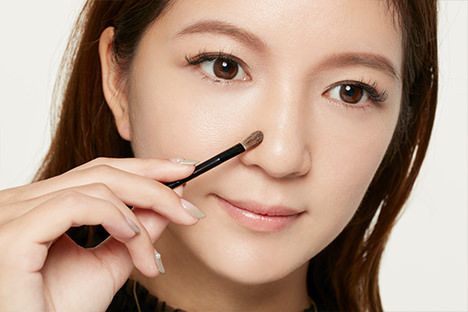 3. 用小化妝掃沾取比原本膚色稍深的粉底,或是淺色眉粉,由眉頭向鼻頭方向塗抹。接著,沿著鼻頭兩側來回刷上陰影顏色,修飾鼻型並加強立體感。