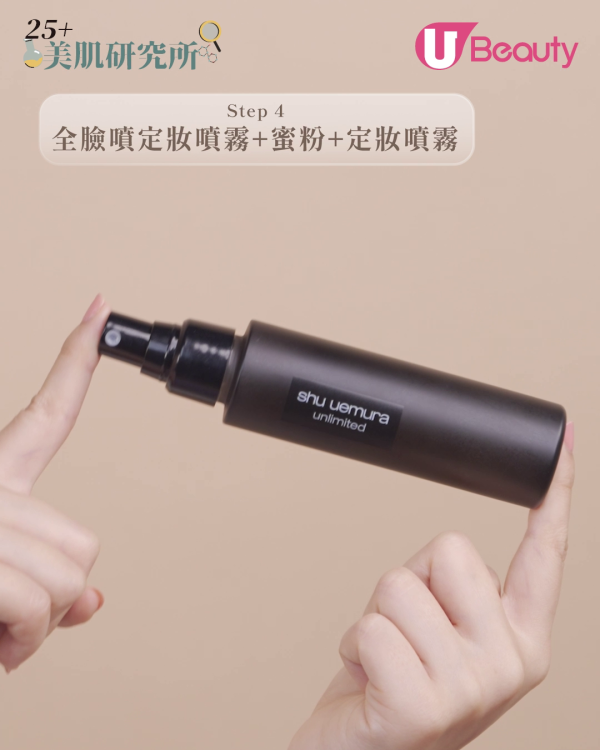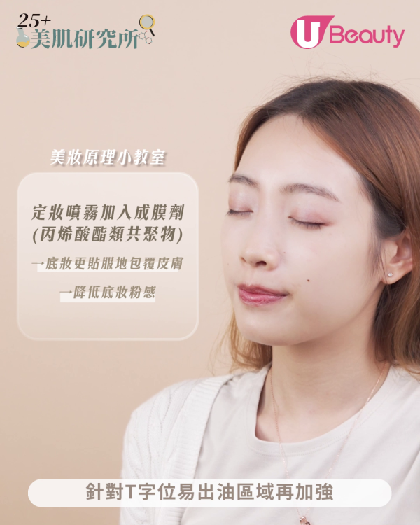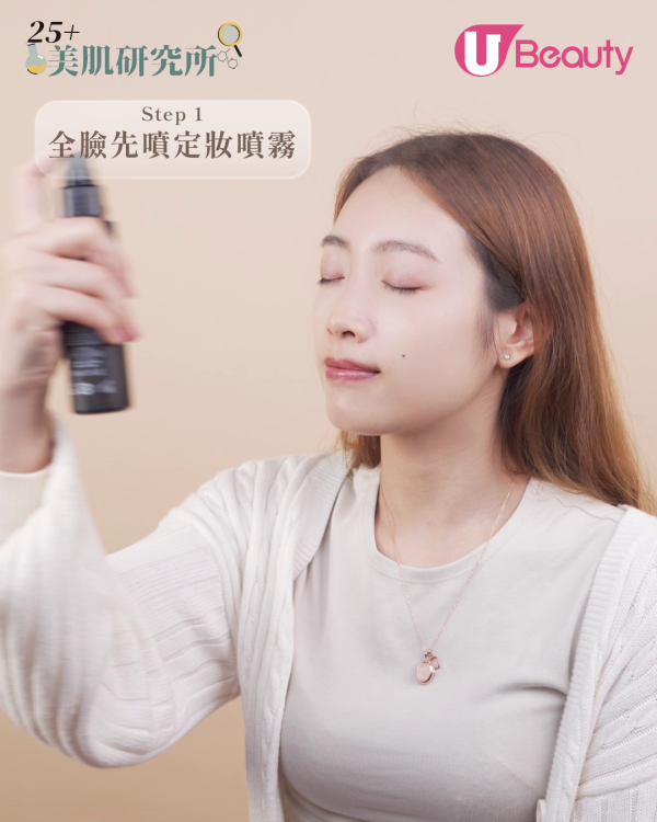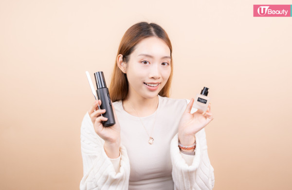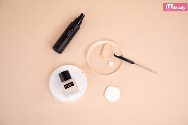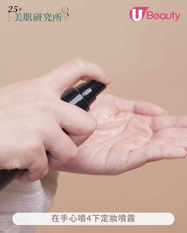 在手心噴4下定妝噴霧,再擠出與平日差不多用量的粉底液。定妝噴霧加入成膜劑(丙烯酸酯類共聚物),可以使底妝更貼服地包覆皮膚,降低底妝粉感,並提升整體妝容持久度。
