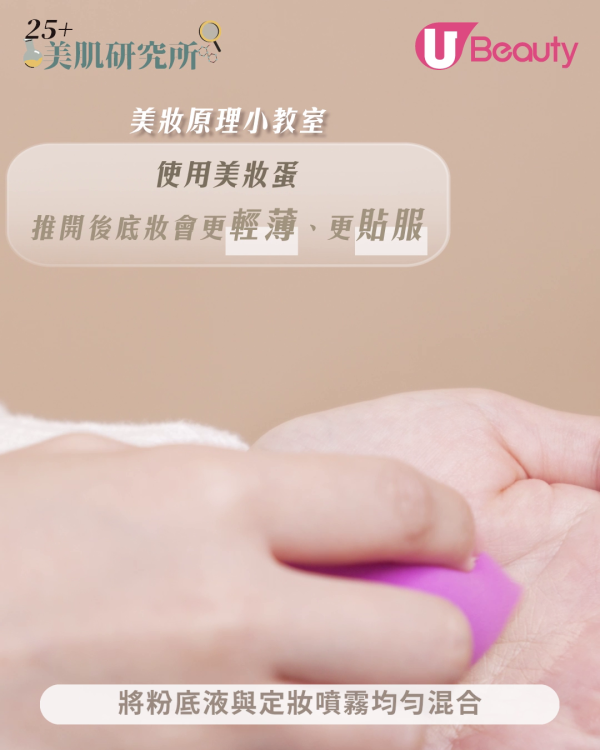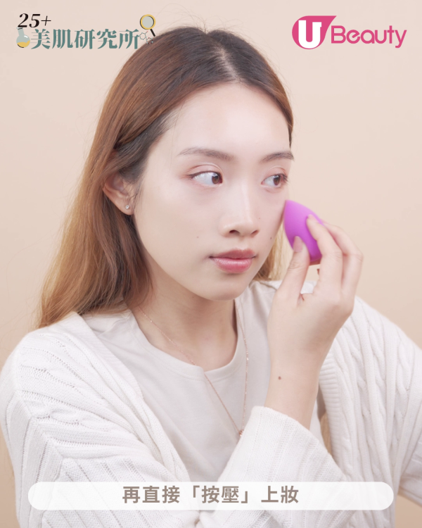 使用美妝蛋將粉底液與定妝噴霧均勻混合,再直接「按壓」上妝。利用美妝蛋上妝,底妝會更輕薄、更貼服。