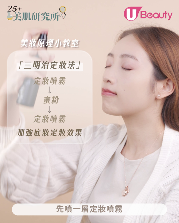 也就是網絡上大熱的「三明治定妝法」:先噴一層定妝噴霧,待噴霧成膜乾燥後,再用Beauty Blender輕壓薄薄一層蜜粉。最後噴少量定妝噴霧即成!
