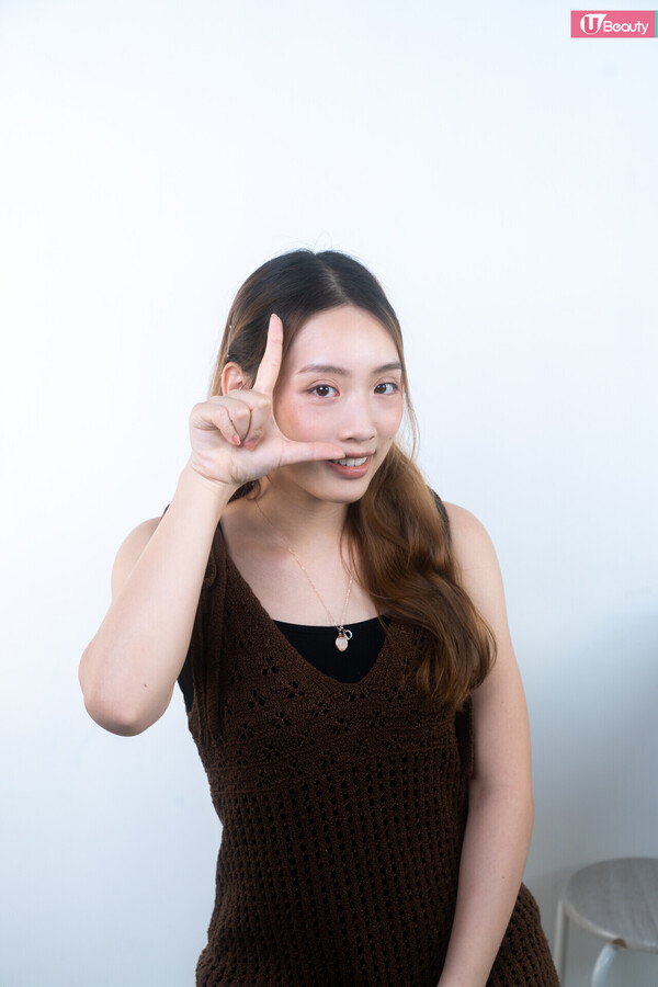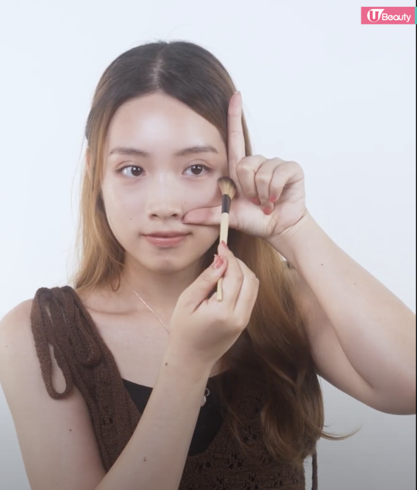 首先做出L手勢,手指公對著鼻翼、食指指著太陽穴。在這個L範圍內掃上胭脂,沿著手指的位置慢慢暈染胭脂,完成後用乾淨的掃將邊界過渡得更自然。這個畫法修飾面形之餘亦相當可愛!加上有手指的幫助便不怕胭脂範圍越掃越大,很適合新手用!