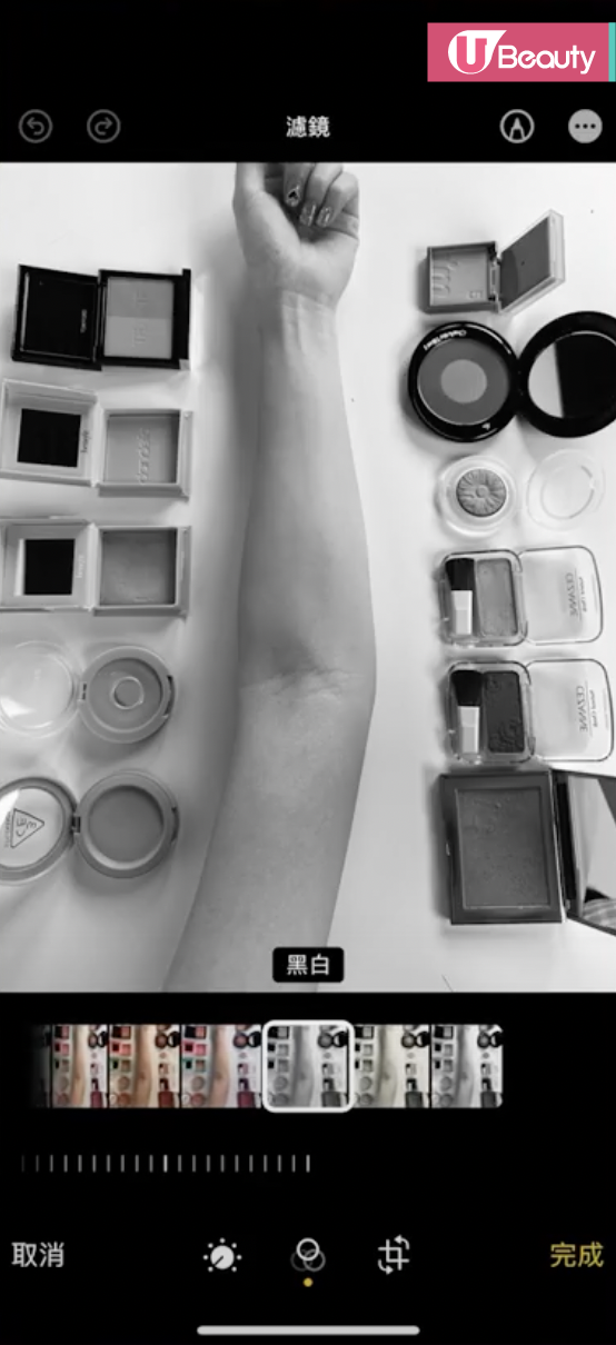 在分享第3個胭脂畫法前,先教大家將胭脂分3大類!使用得宜分分鐘達至整容級別!3大類分別是膨脹色、收縮色和主色胭脂,大家可以將家中的胭脂放在枱上,再與你的手臂合照,將相片調成黑白色後,就可以分辨出3類胭脂。