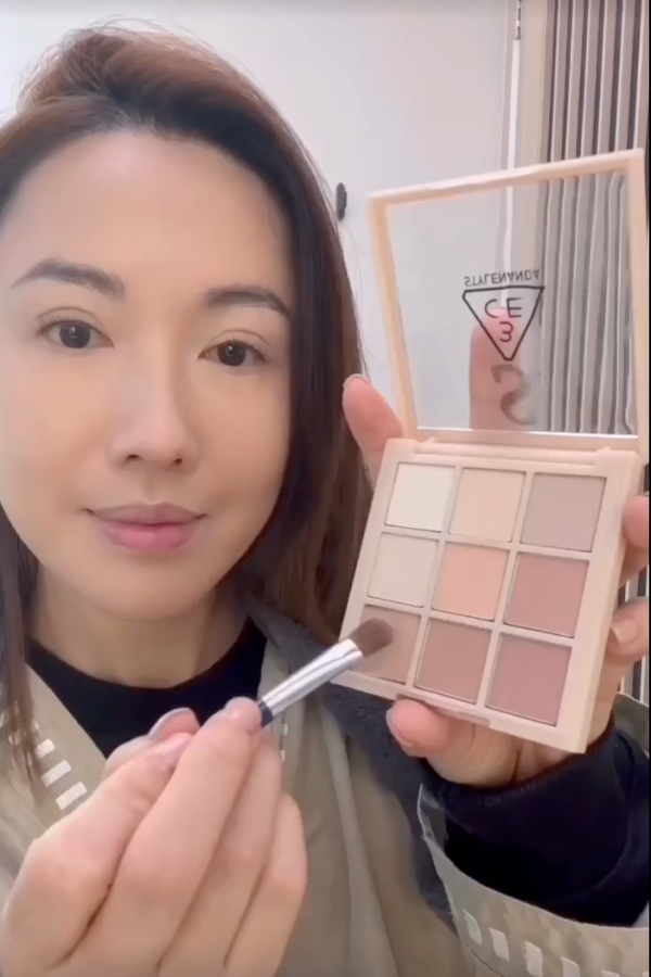 在眼妝方面,張家妍的形象要求看似自然有神,卻不失氣勢。首先,利用淺色眼影在眉骨位置輕輕打亮,再運用啡色眼影突出眼窩位置,再在下眼線位置輕輕畫幾下,勾勒出雙眼的輪廓。李施嬅透露了增添眼妝光澤感的秘訣,即是混入粉紅色調。而在畫眼線的過程中,她推薦使用蠟質眼線筆,強調了其自然效果。最後,以深啡色眼影加強眼線柔和度,再搭配防水睫毛液,使整體眼妝更為完美。