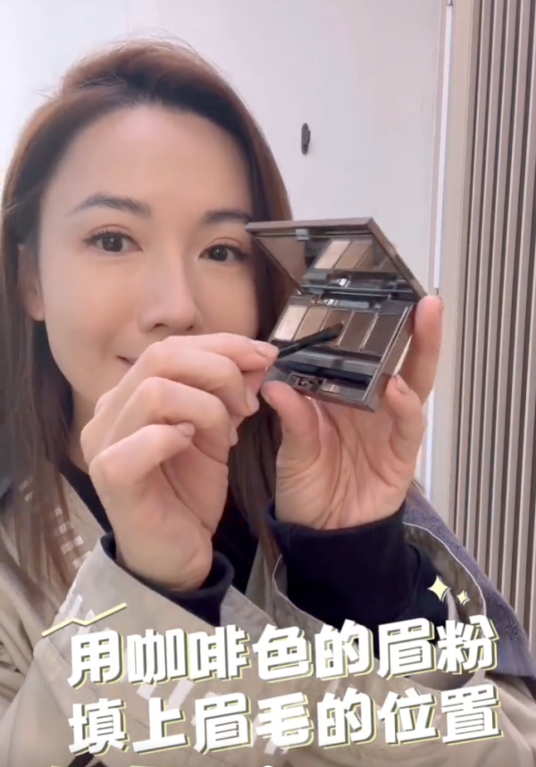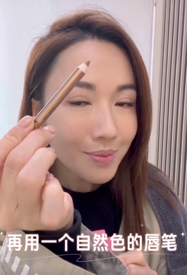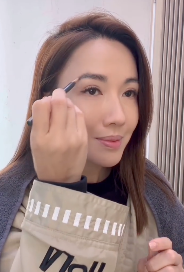 眉妝方面,「張家妍」的形象要求呈現自然且具有小臉效果。李施嬅建議使用啡色眉粉填滿眉毛位置,使其看上去更為自然。接著,以眉筆拉長眉尾位置,巧妙地營造小臉效果,展現拼搏記者的專業氣質。