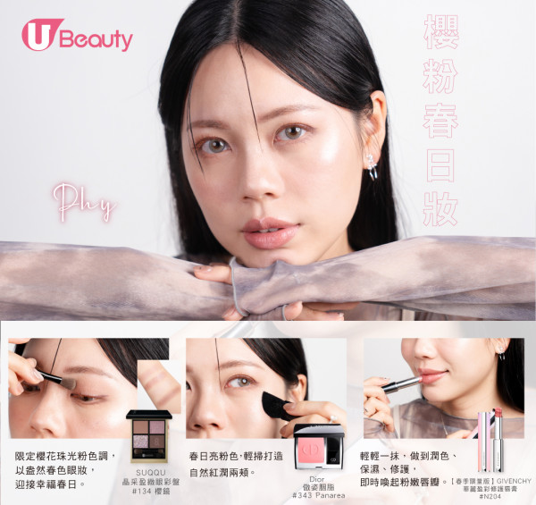 集合SUQQU、Dior、RMK與GIVENCHY等品牌2024年春季彩妝新品,以「櫻粉X 水之綾緞」春日妝容提案為題,U Beauty 兩位美編示範2款絢麗多彩日系妝容。在日系透明感裸妝主調下,融入今年春季流行的亮粉藍色、櫻粉色眼妝。更率先試用即將登陸香港的SUQQU皇牌產品,包括日本美妝界討論度超高的#櫻鏡 # 日向織 春季限定眼彩盤。