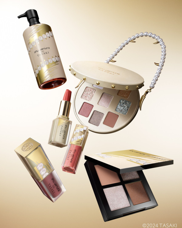 植村秀shu uemura攜手時尚珠寶品牌TASAKI ,以標誌性珍珠設計,融合植村秀妝藝美學,打破常規純奢華風格,打造出白色珍珠光澤與未來感的金屬調「高雅叛逆 Y3K美妝」限定聯乘系列。其中限量版眼影組合「萬物流金」靈感源自TASAKI標誌性系列「danger 」,以9款從金色到銀色充滿未來感的金屬色調,配搭黑珍珠與粉紅珍珠光感色調,展現珍珠光澤與黑金屬感的混合妝效。