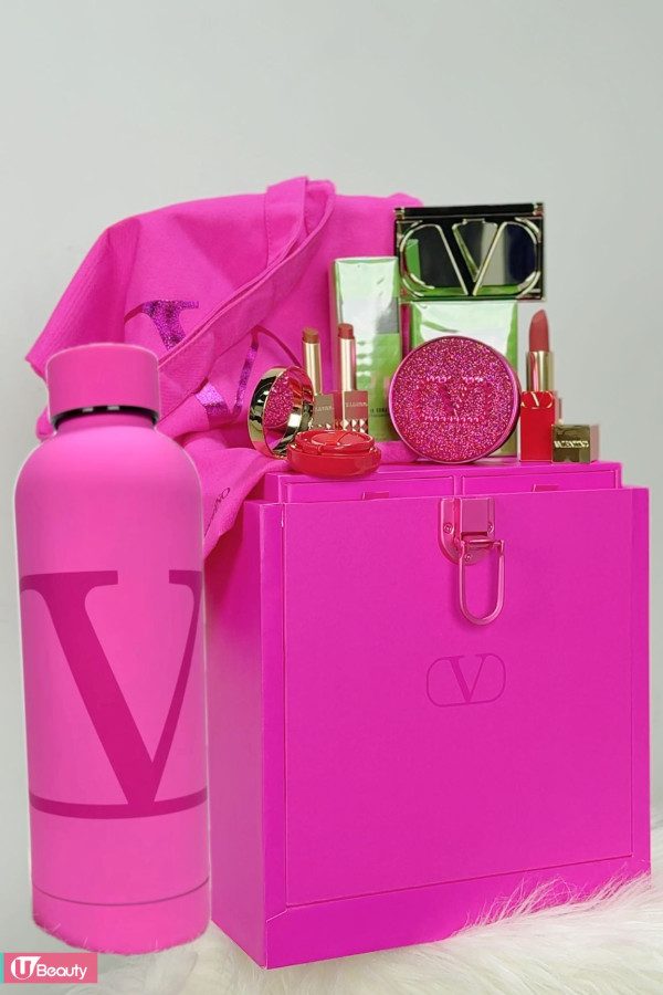 全港限量只有100份的Valentino粉紅禮盒一共收納10件限量商品,當中包括Go-Cushion Glow Pink限量版、迷你Go-Cushion、Rosso Valentino唇膏、Spike Valentino唇膏2支、Born In Roma Donna Green Stravaganza香水50ml+15ml各一支、限量隨身化妝鏡、以及限量隨身Party in Pink水樽和隨行帆布袋,以粉紅填滿今個聖誕!