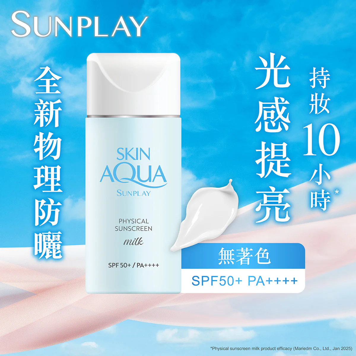 SUNPLAY 純物理礦物防曬乳液 SPF50+/PA++++ | 0%化學防曬,隱形不泛白,敏感肌適用 | 乳液 (Milky Lotion) | ★★★★★ | 物理防曬 | $185 / 50ml | 4.8/5 ★ | 敏感肌首選,控油持妝 |