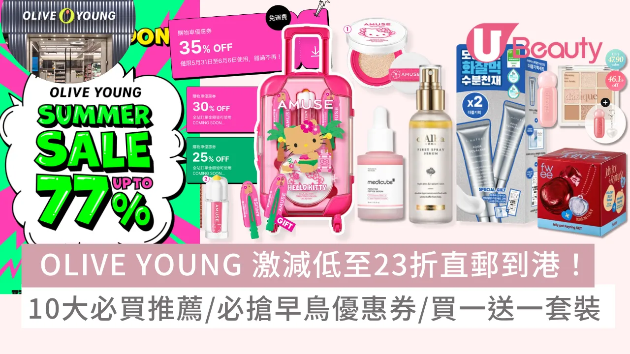 OLIVE YOUNG Global官網SUMMER SALE 夏季大促預告開鑼,由5月31日至6月6日,為期一週限時激減,多款護膚、彩妝、美髮、面膜折後價低至23折,比在韓國買仲抵買!即睇下文搶購秘訣,精選10大OLIVE YOUNG必買推薦、限時必搶早鳥優惠券、限定買一送一套裝!購買滿$60美元即可免運費直郵到港,各位美妝迷們,務必把握時機掃貨!