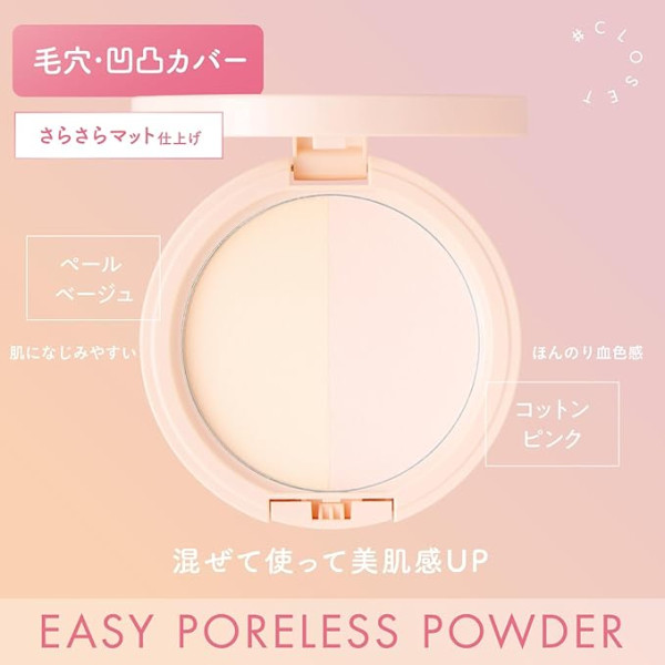 日本彩妝品牌Number Closet(#Closet),今年初推出了Easy Poreless Powder,配方蘊含反光粉,遮蓋暗沉及提亮膚色,讓肌膚由內而外散發細膩光澤。另外,亦添加荷荷巴油和玫瑰果油,加強保濕效果,控制多餘油脂。雙色設計均勻膚色,同時打造透亮妝效。